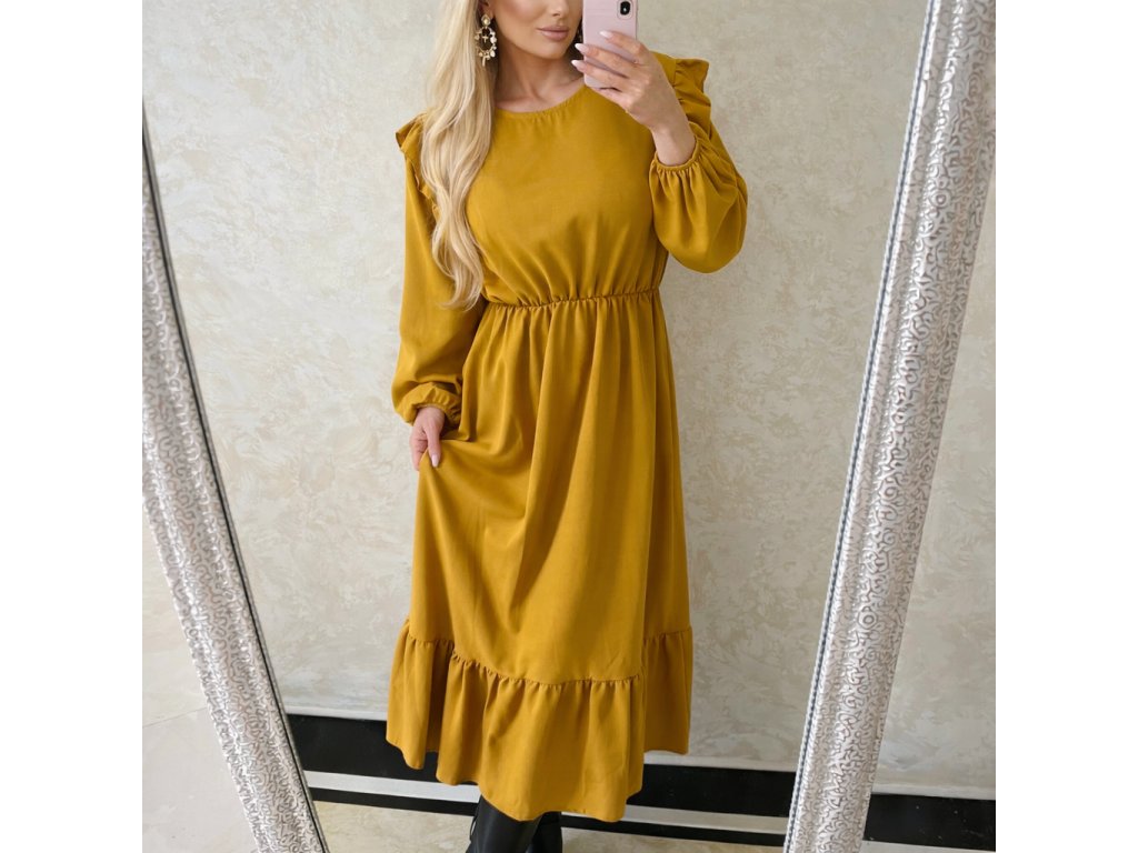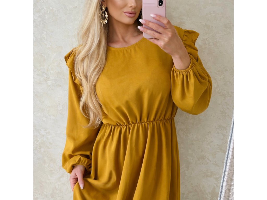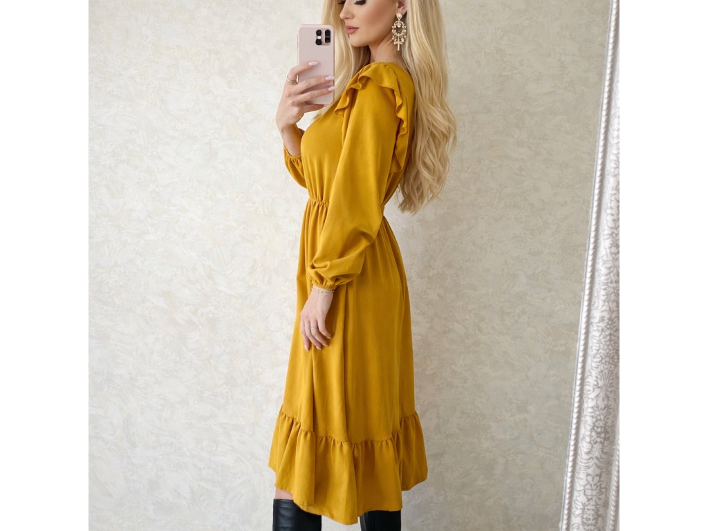 Dámske romantické šaty výraznej horčicovej farby. Padavý ,nekrčivý materiál. S volánmi.