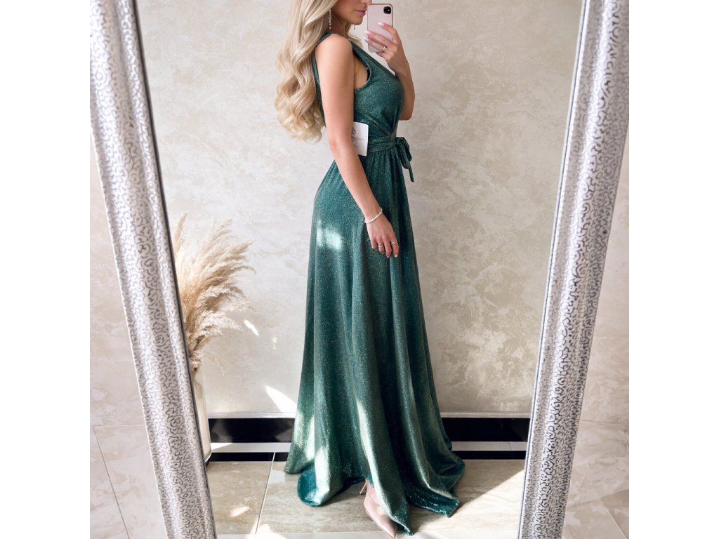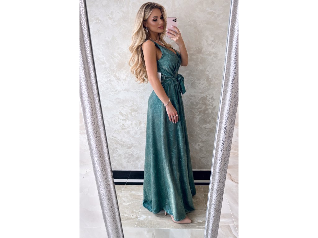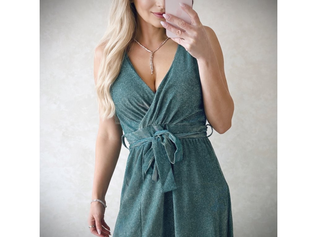 Dámske spoločenské šaty trblietavé, s metalickým nádychom mentolovej zelenejj farby. Veľkosť je UNI,sadne na S,M,možno aj menšie L. Prsia su vystužené. V páse sa sťahujú látkovým opaskom. Krasne sa prisposobia postave, Zips na zadnej strane. Vyrobené v Taliansku.