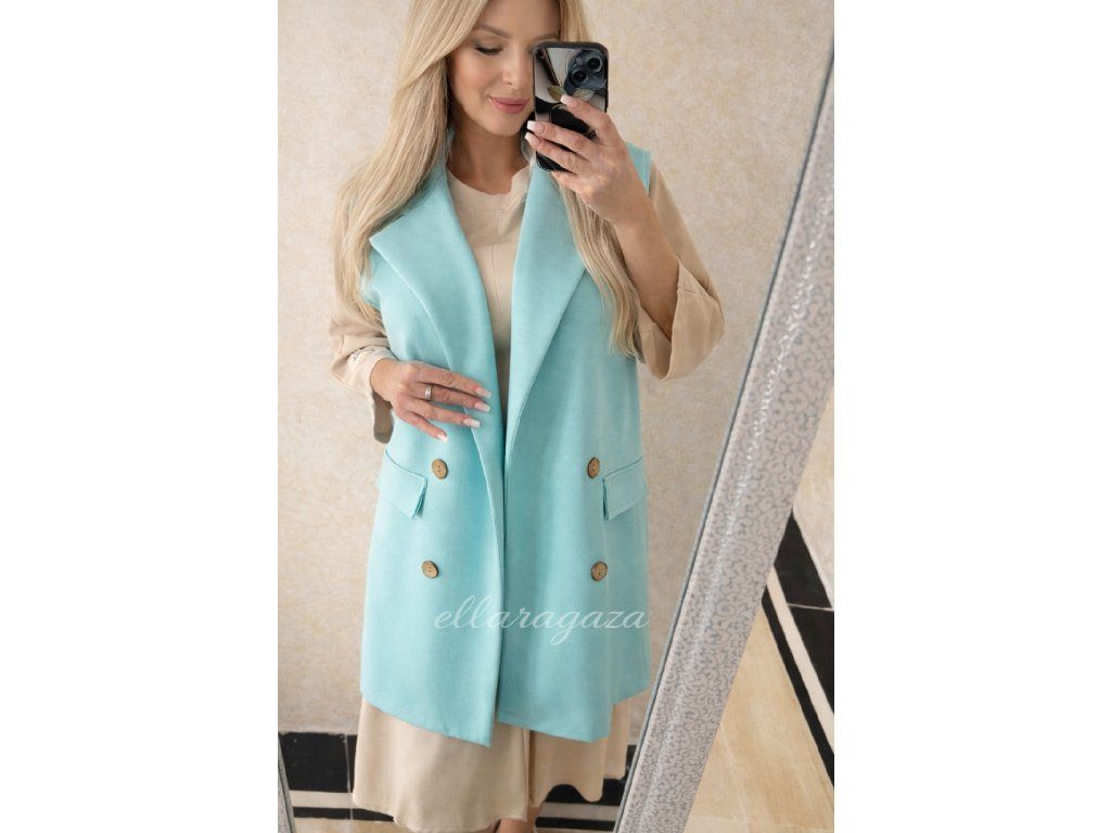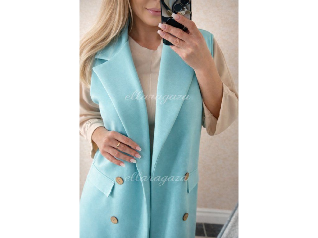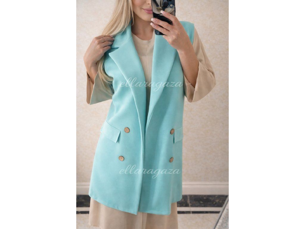 Minimalizmus, ktorý zaujme na prvý pohľad. Táto predĺžená vesta v jemnom aquamarine odtieni dodá každému outfitu sviežosť, ženskosť a moderný nádych elegancie.
