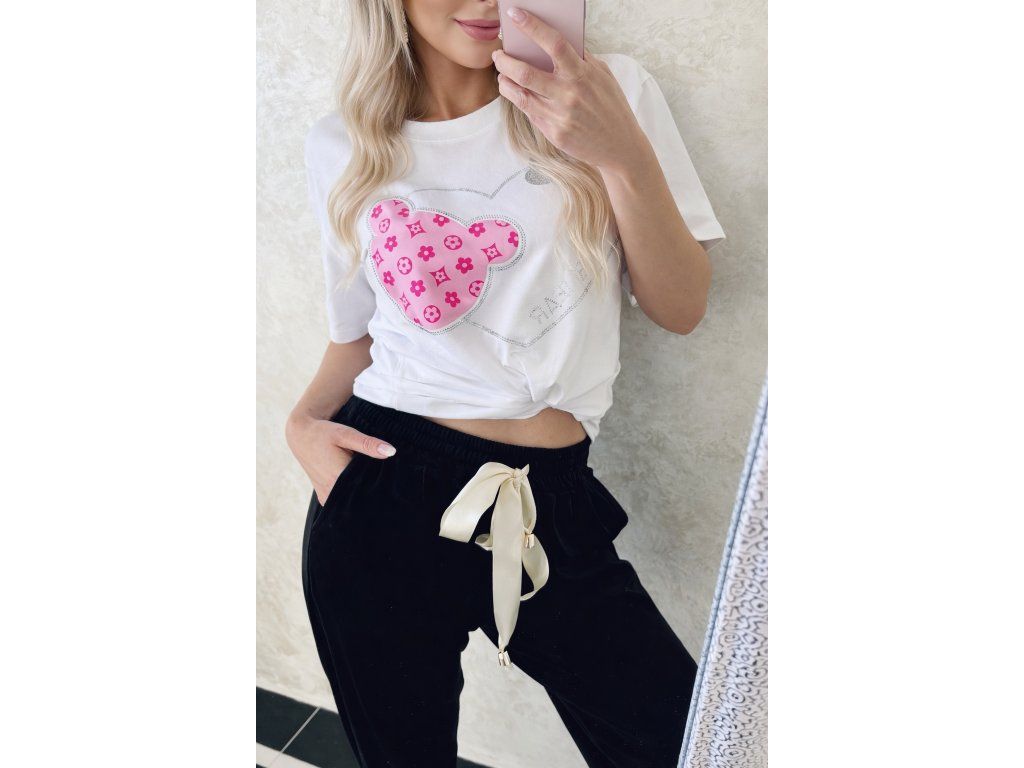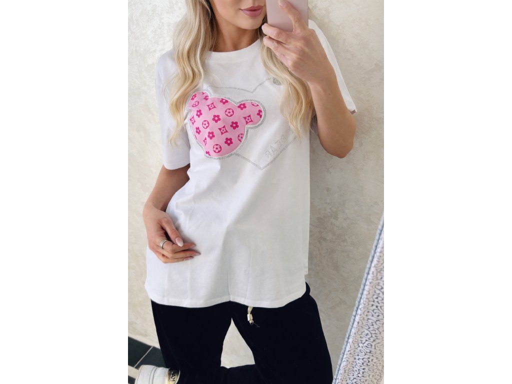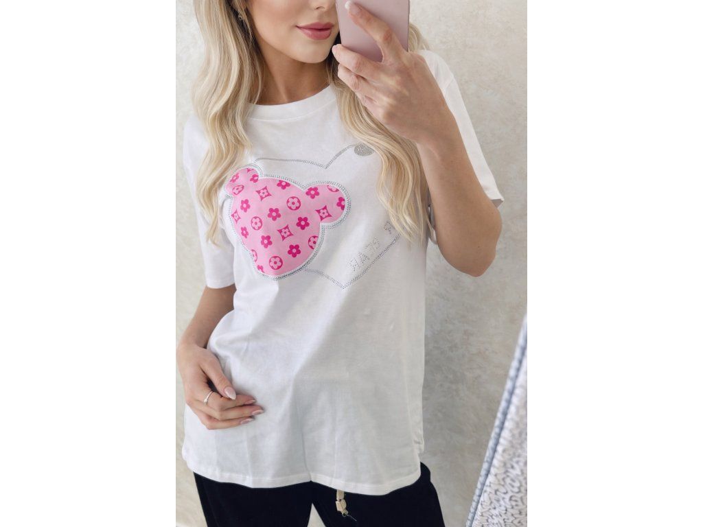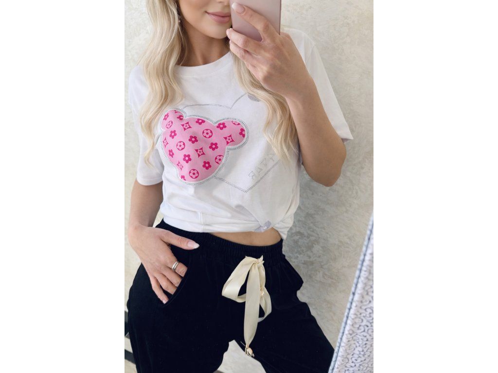 Moderné dámske tričko z príjemnej bavlny zaujme na prvý pohľad svojím výrazným a hravým dizajnom. Prednú časť zdobí efektná aplikácia s jemnými kamienkami a kontrastným ružovým vzorom, ktorá dodáva celému kúsku luxusný a ženský nádych.