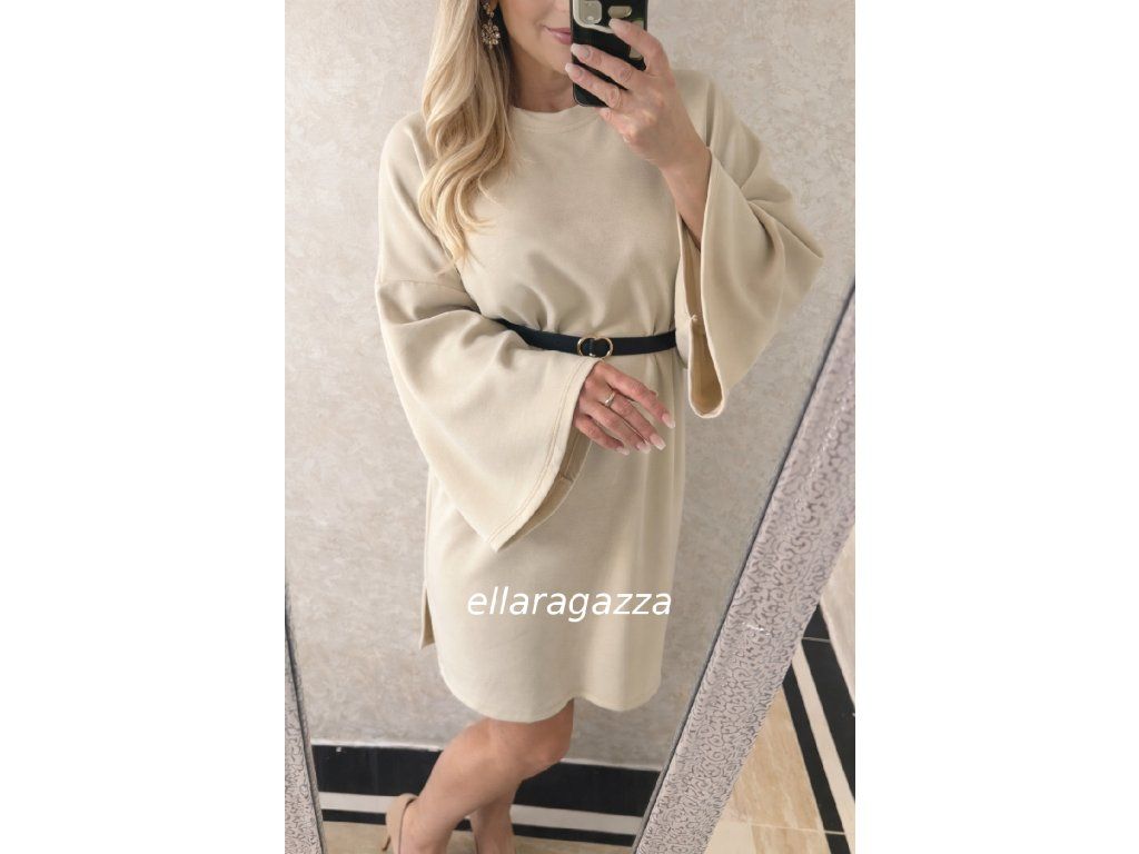 Dominantou modelu sú jemne rozšírené rukávy, ktoré dodávajú šatám ľahkosť a originálny charakter. Minimalistický dizajn umožňuje jednoduché kombinovanie – či už s lodičkami pre elegantný look, alebo s čižmami pre moderný mestský štýl.
