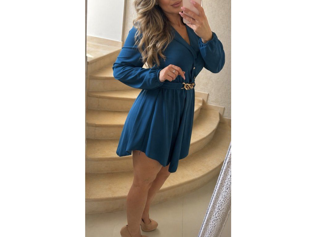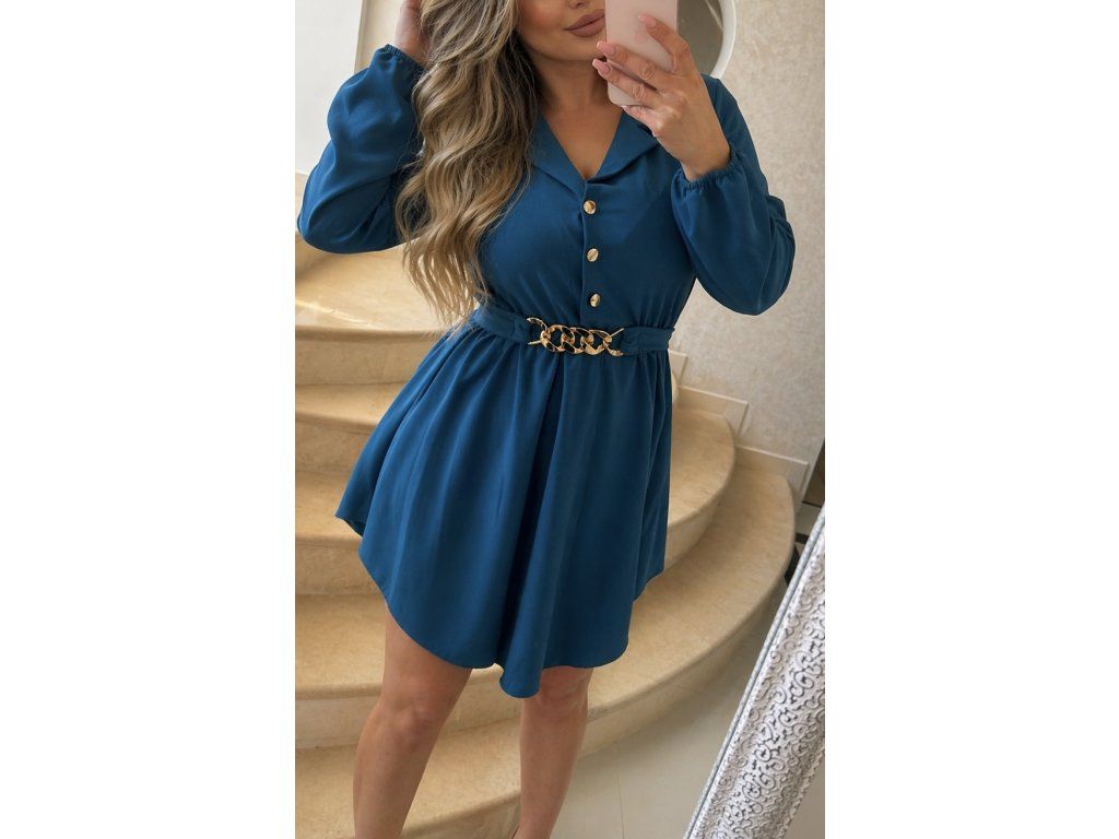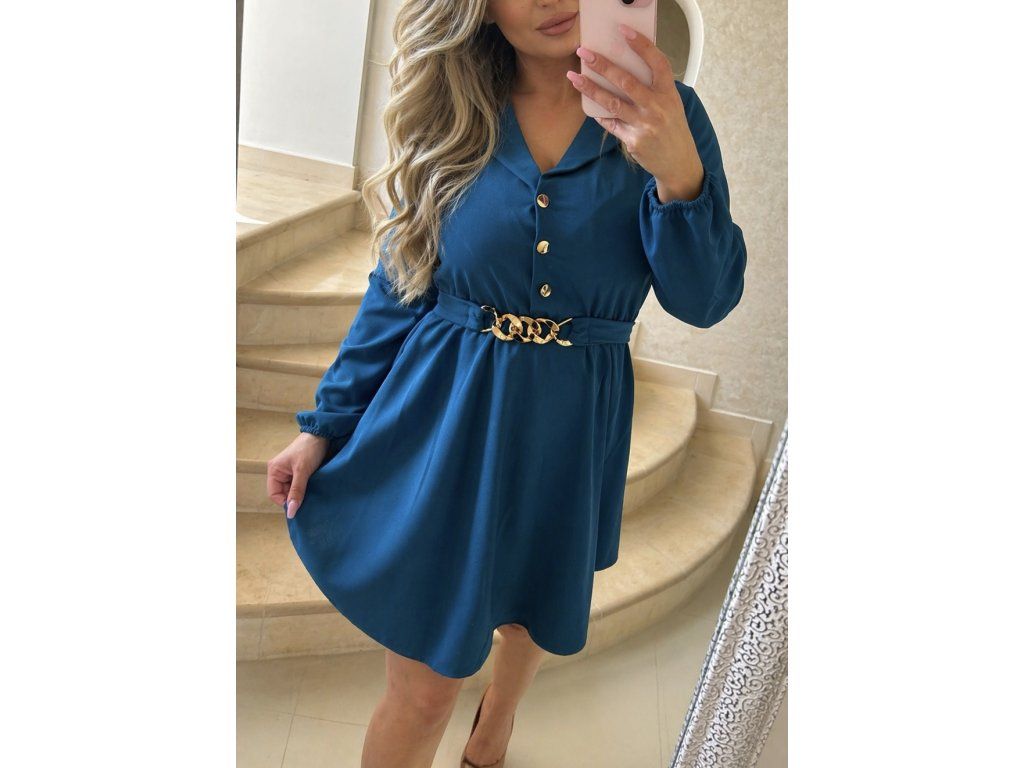 Vrchná časť s gombíkmi a decentným golierom dodáva šatám sofistikovaný nádych, zatiaľ čo dlhé rukávy zakončené gumičkou zabezpečujú pohodlie pri nosení. Výrazný opasok so zlatou reťazou zvýrazní pás a dodá celému outfitu moderný, štýlový detail.