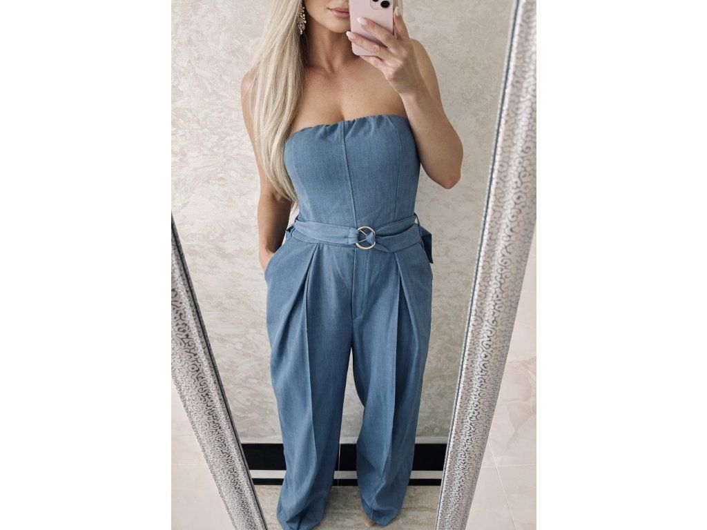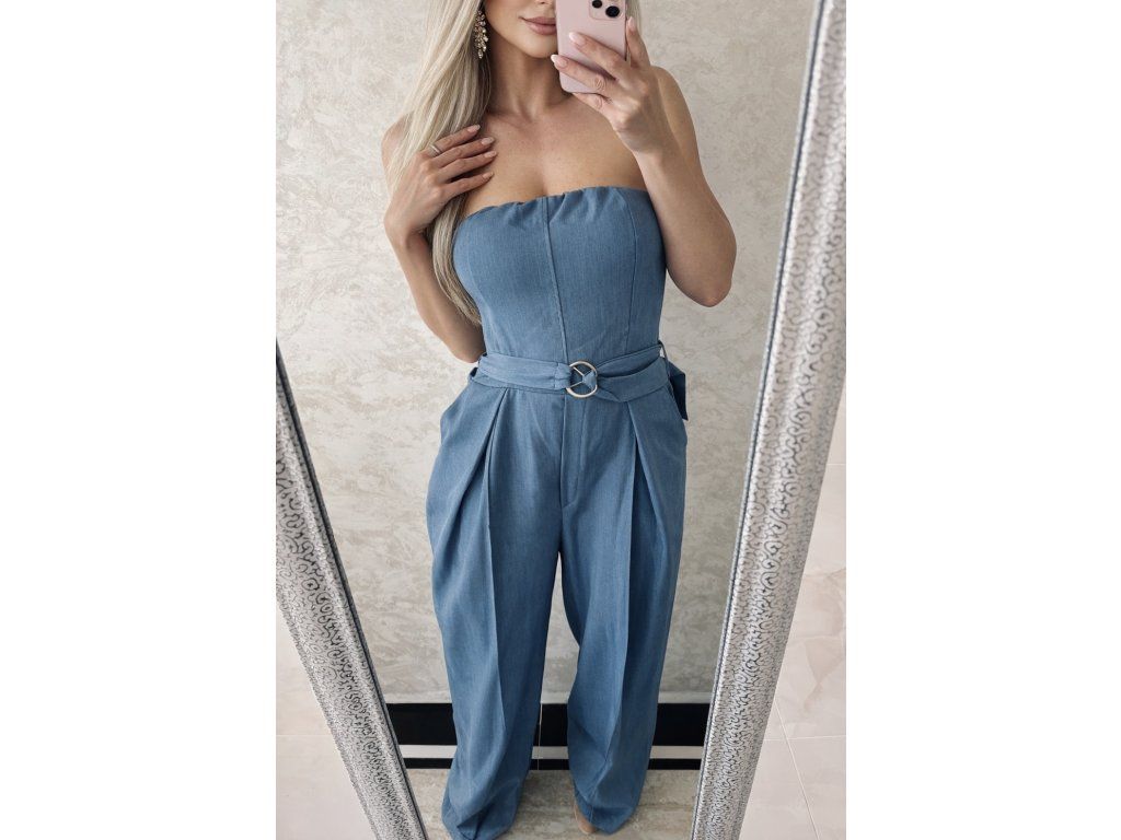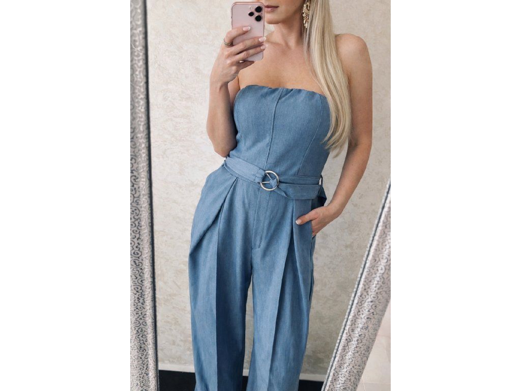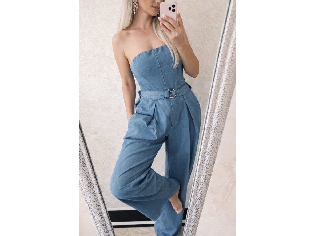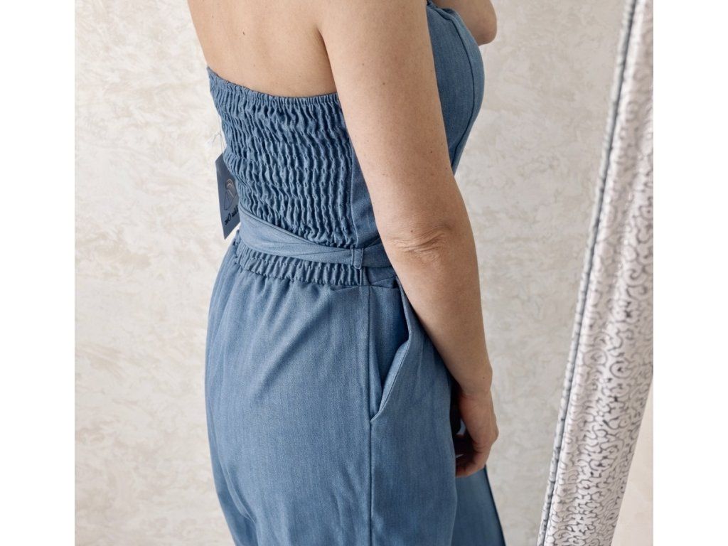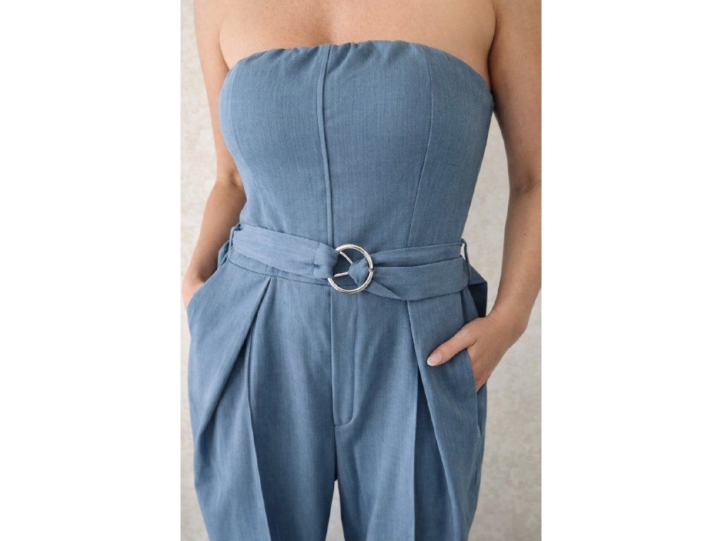 Štýlový dámsky overal v krásnej tlmenej modrej farbe, ktorý spája eleganciu a pohodlie. Vrchná časť bez ramienok krásne zvýrazní dekolt, zatiaľ čo elastický zadný diel zabezpečí perfektné prispôsobenie postave.