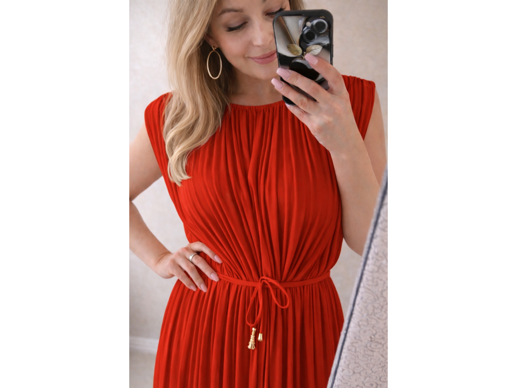 Nadčasové plisované šaty v sýto červenej farbe, ktoré zaujmú svojou jednoduchosťou a ženskou eleganciou. Jemne riasený materiál krásne splýva a lichotí postave, zatiaľ čo tenká šnúrka v páse umožňuje prispôsobiť siluetu podľa potreby.