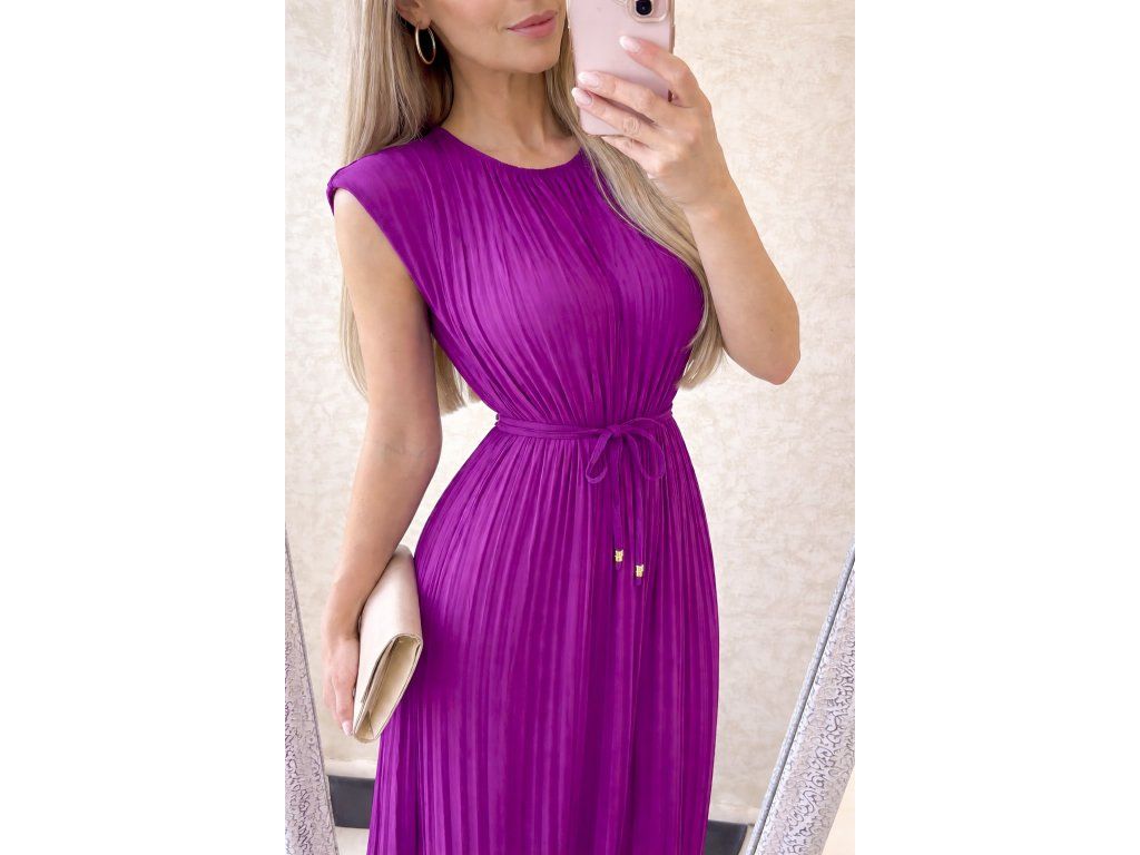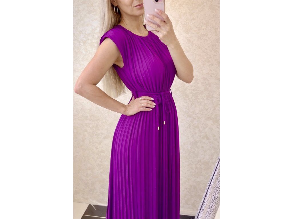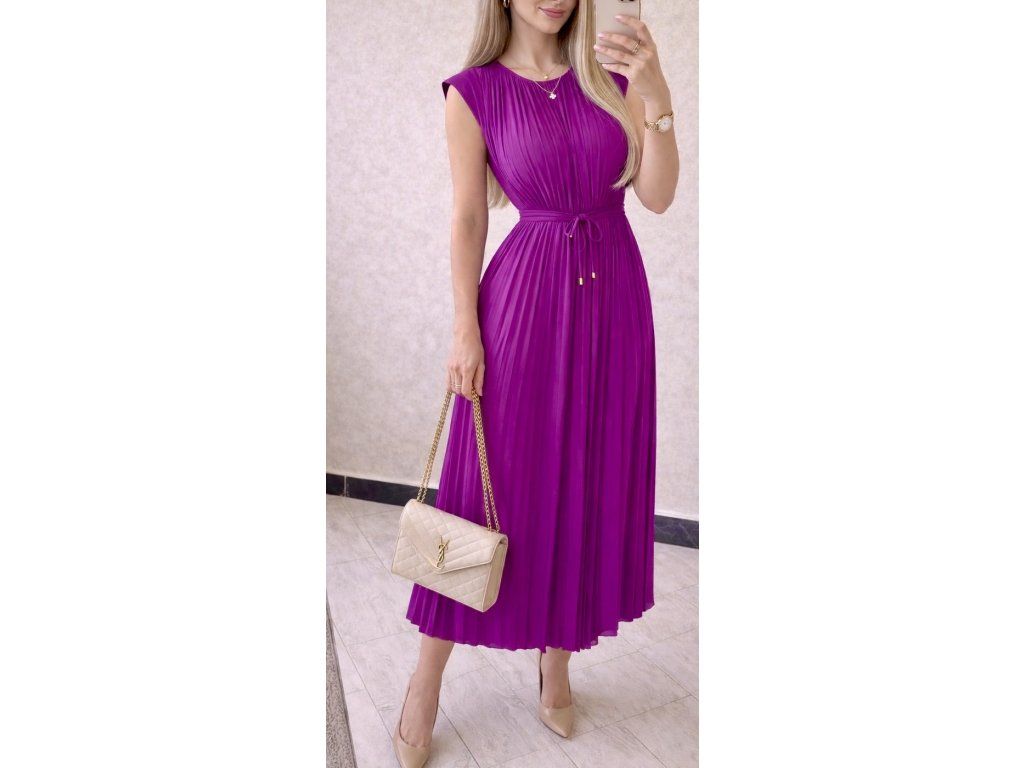 Štýlové a nadčasové šaty, ktoré si zamiluješ na prvé oblečenie. Jemné plisovanie dodáva modelu ľahkosť a krásny pohyb pri chôdzi, zatiaľ čo výrazná fialová farba pôsobí luxusne a neprehliadnuteľne.