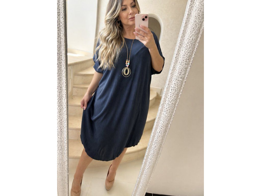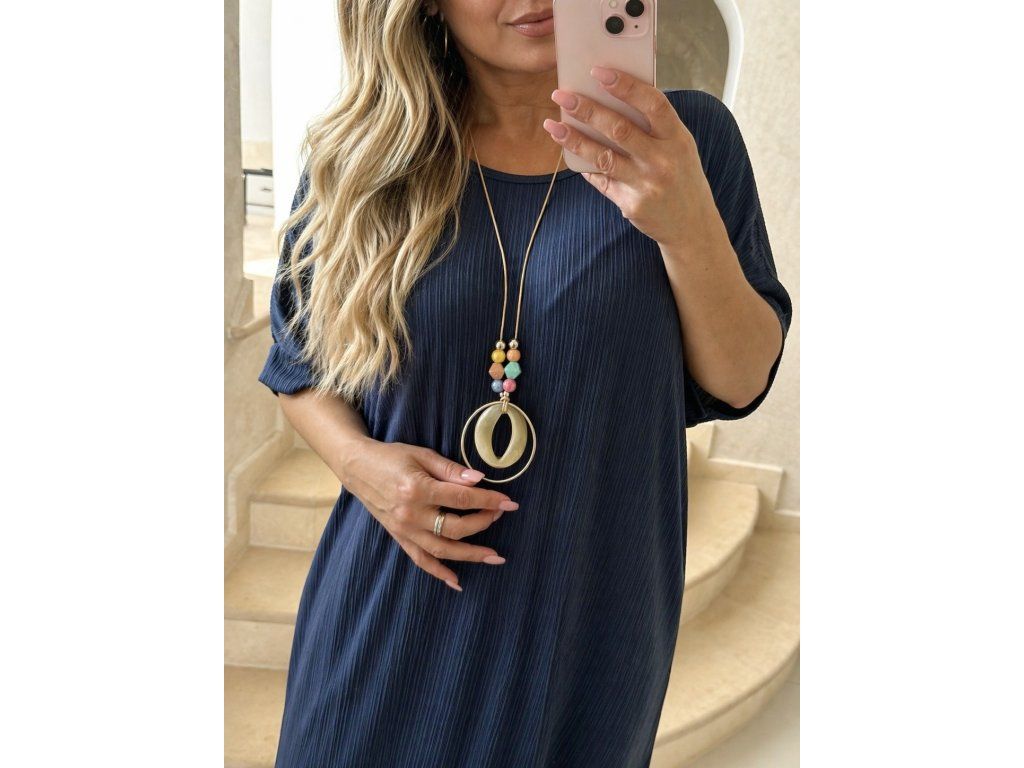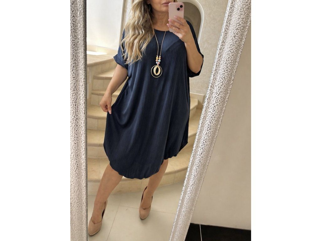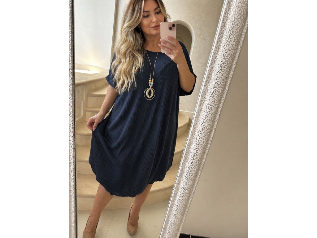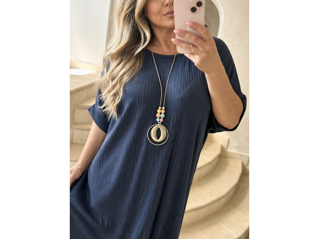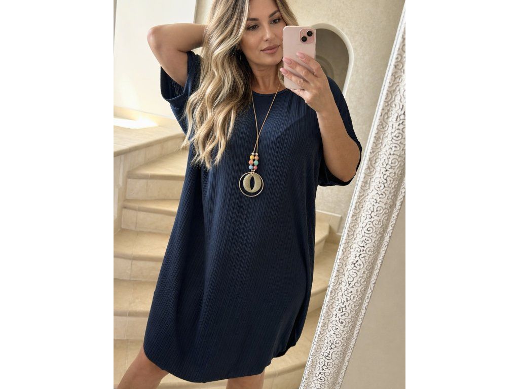 Elegantné a maximálne pohodlné šaty v nadčasovej tmavomodrej farbe sú ideálnou voľbou na každý deň aj voľnočasové príležitosti. Jemne plisovaný materiál pôsobí luxusne, krásne splýva a prispôsobí sa postave bez zvýraznenia nedokonalostí.