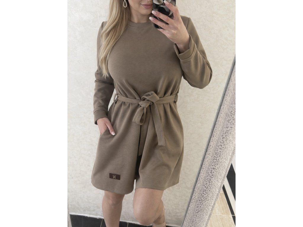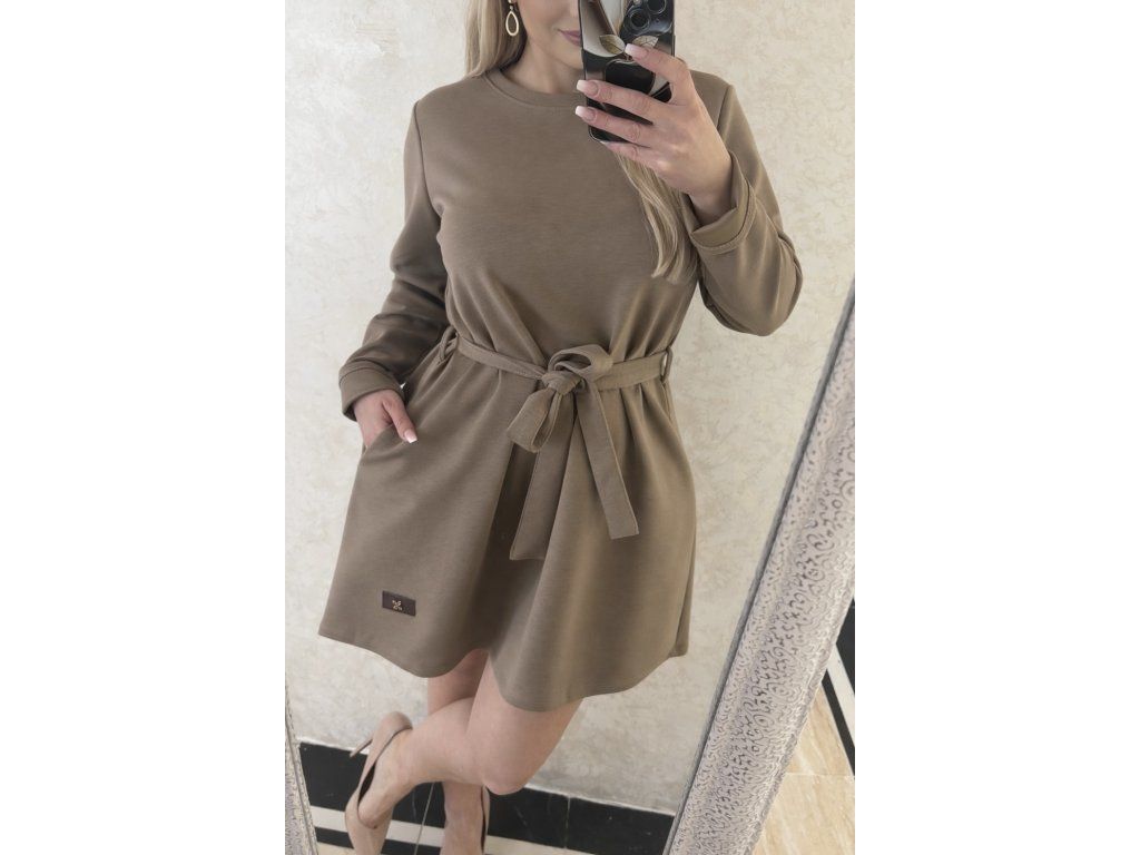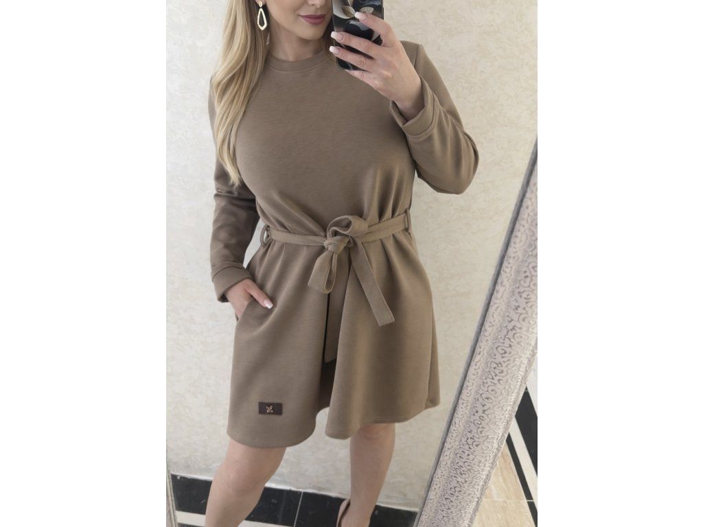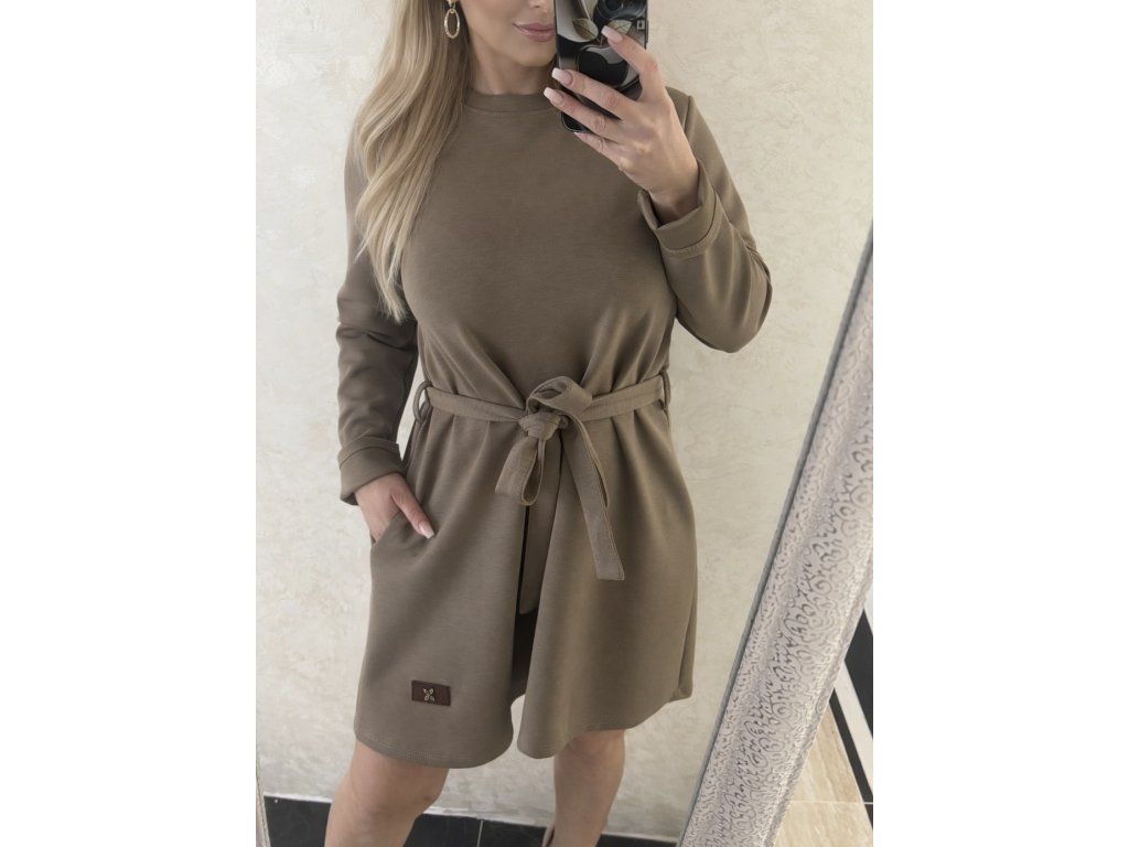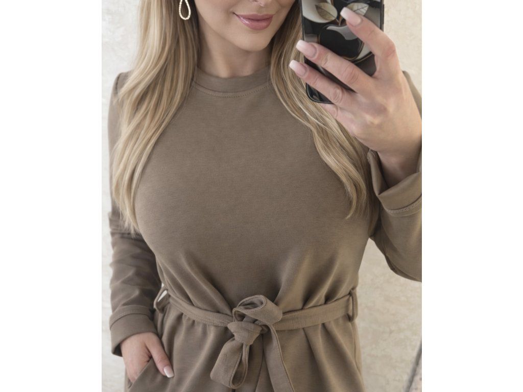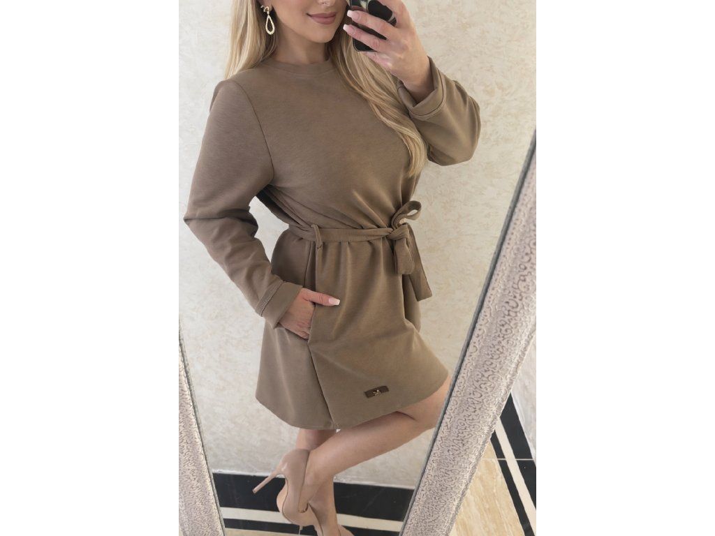 Tieto štýlové šaty v jemnom hnedo-béžovom odtieni sú ideálnou voľbou pre ženy, ktoré milujú kombináciu pohodlia a elegancie. Jednoduchý, čistý dizajn dopĺňa praktické viazanie v páse, ktoré krásne zvýrazní siluetu a dodá postave ženský tvar.