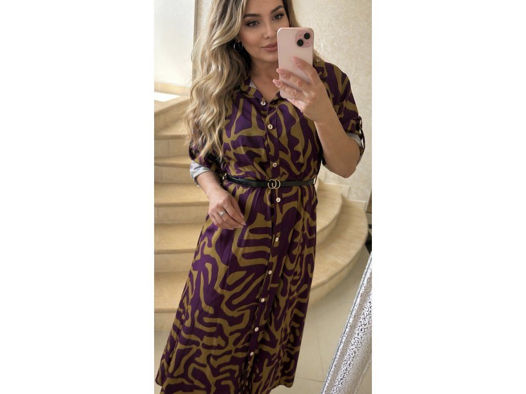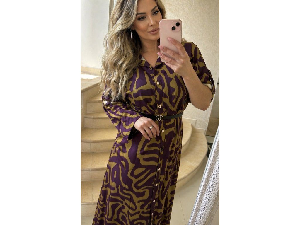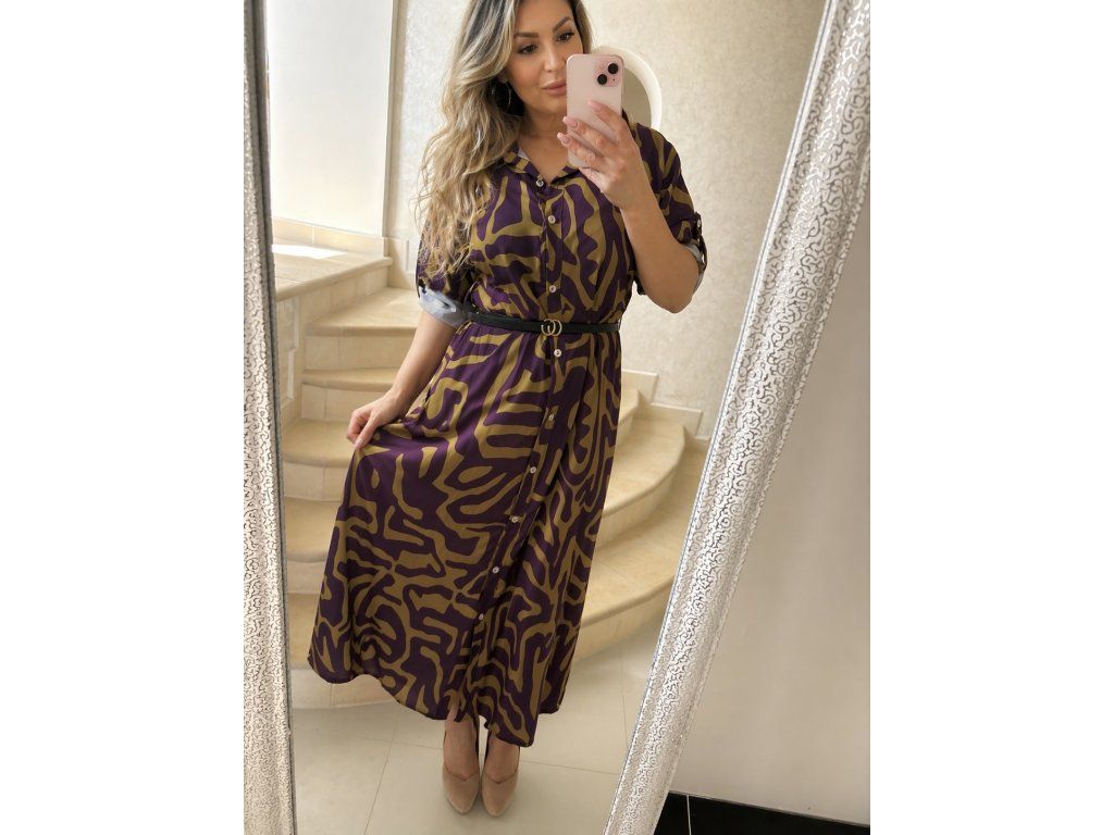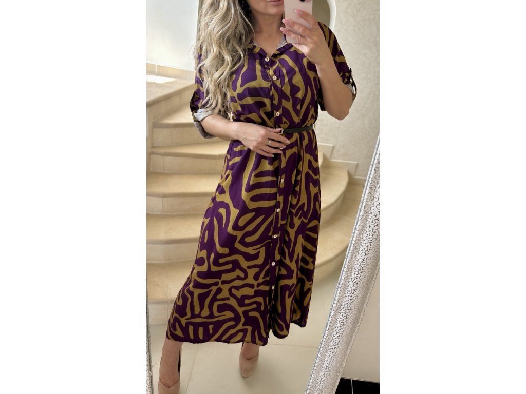Štýlové košeľové šaty v originálnom vzore sú ideálnym kúskom pre ženy, ktoré chcú zaujať a zároveň sa cítiť pohodlne. Kombinácia výraznej fialovej s moderným abstraktným vzorom pôsobí luxusne a trendy.