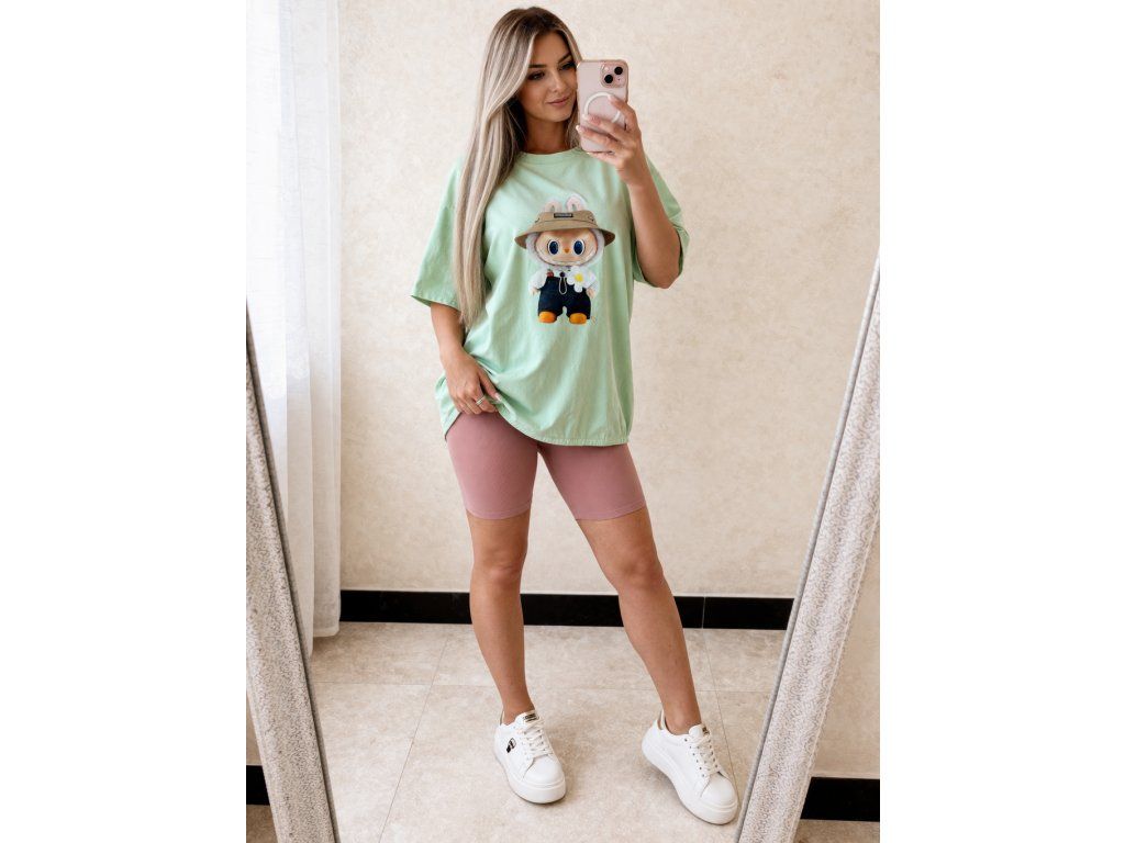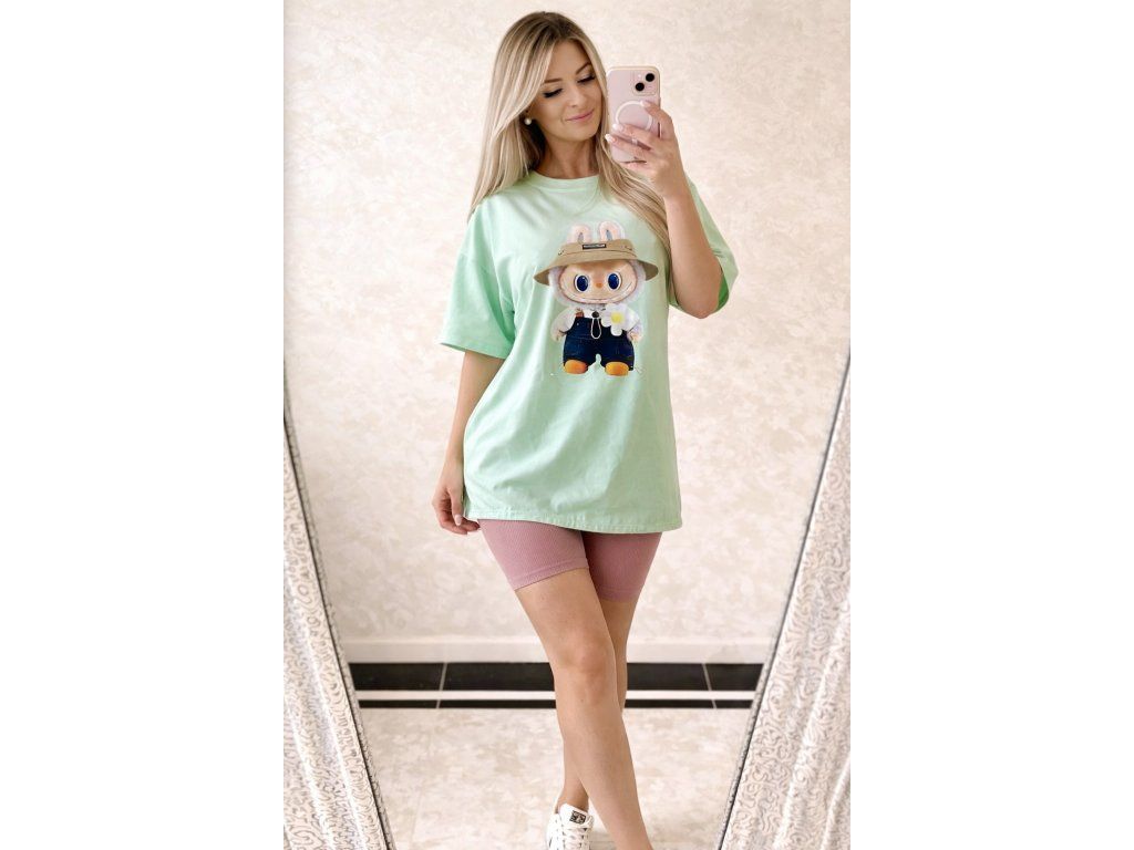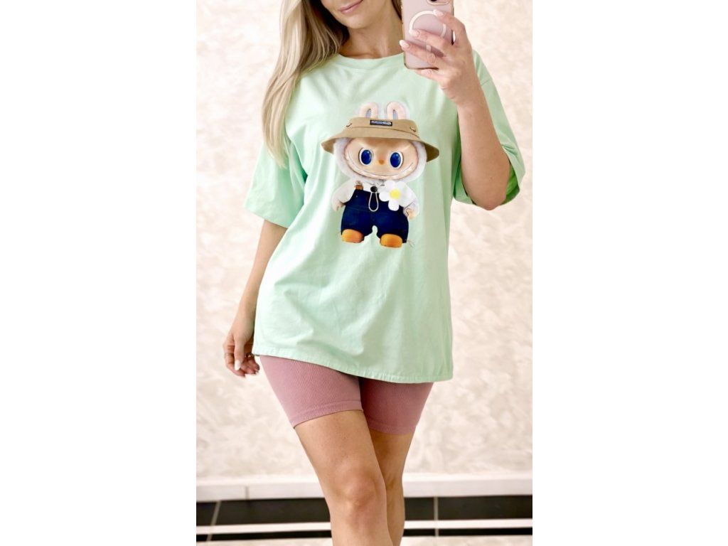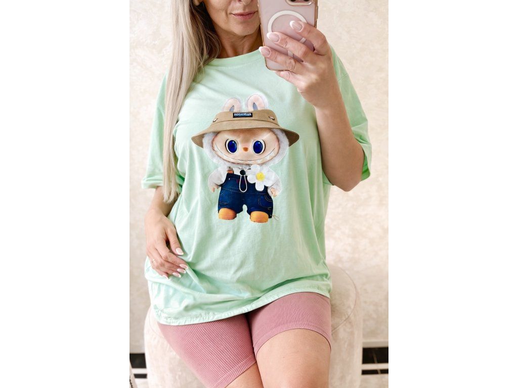 Štýlové a maximálne pohodlné oversize tričko v jemnom mint odtieni je ideálnou voľbou na každodenné nosenie. Dominantou je originálny efekt hravého motívu zajačika LABUBU s klobúkom, ktorý dodáva outfitu jedinečný a trendy vzhľad.