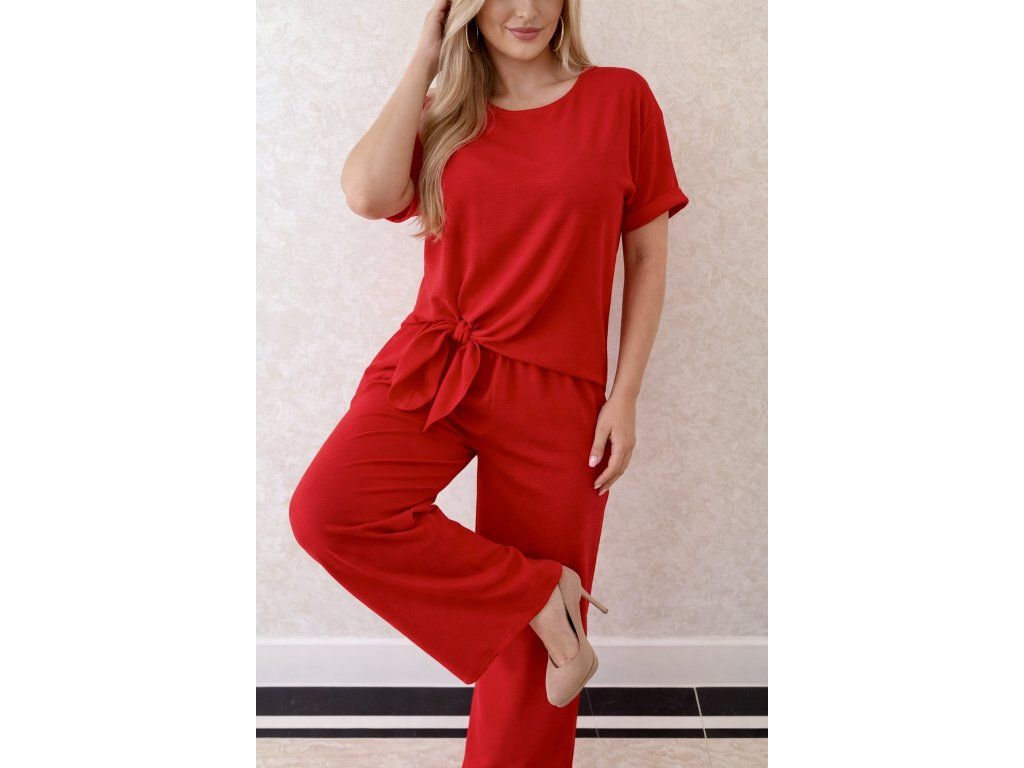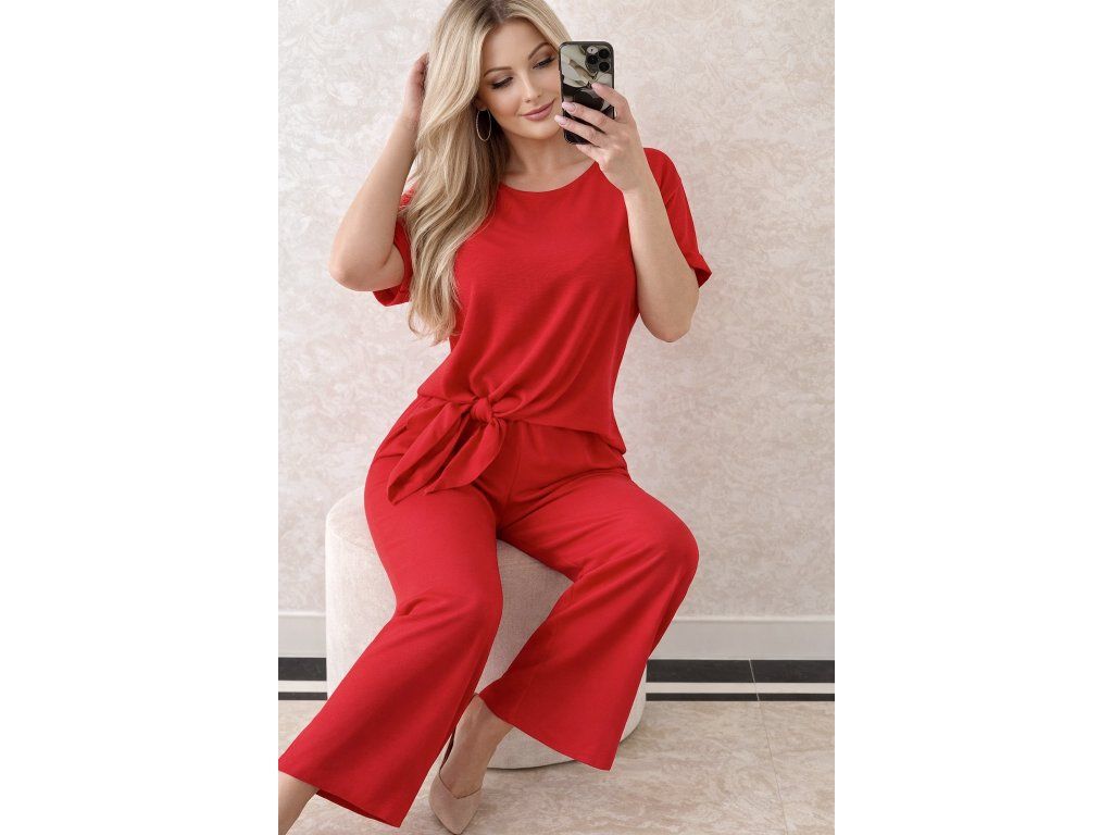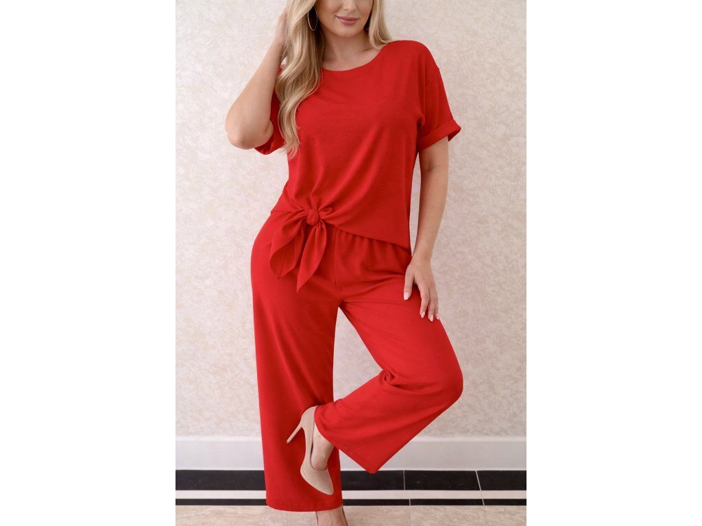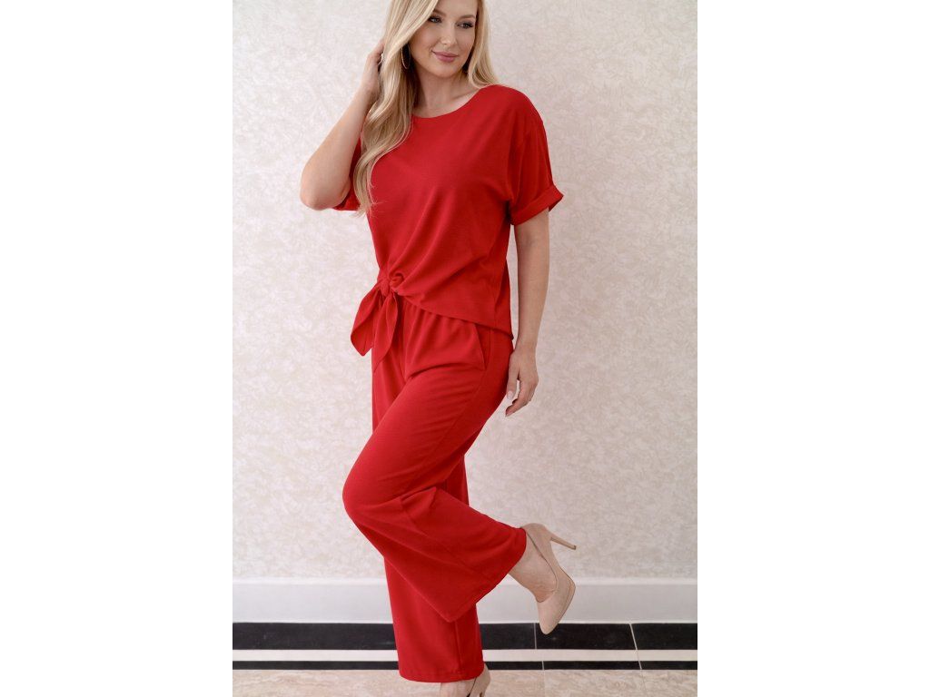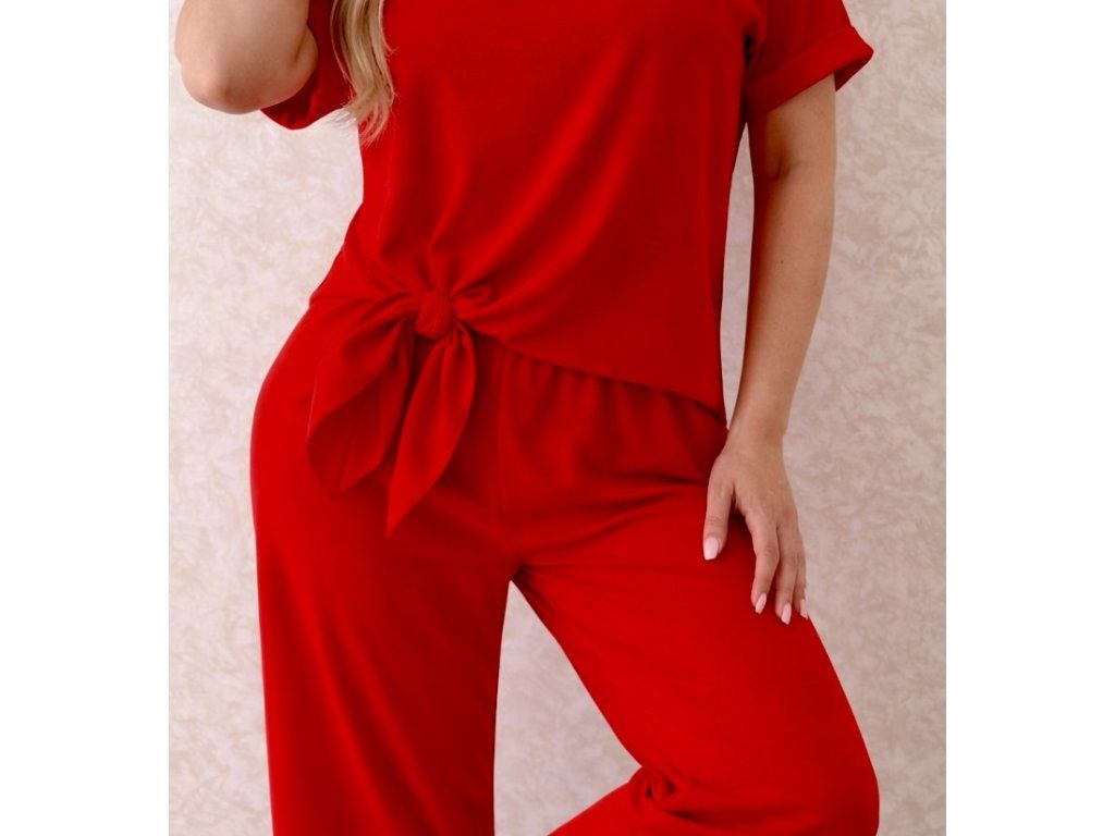 Štýlový a nadčasový dámsky set v žiarivej červenej farbe, ktorý zvýrazní ženskosť a sebavedomie. Set pozostáva z voľnej blúzky s krátkym rukávom a moderným viazaním v páse, ktoré krásne formuje postavu, a pohodlných nohavíc s voľným strihom.