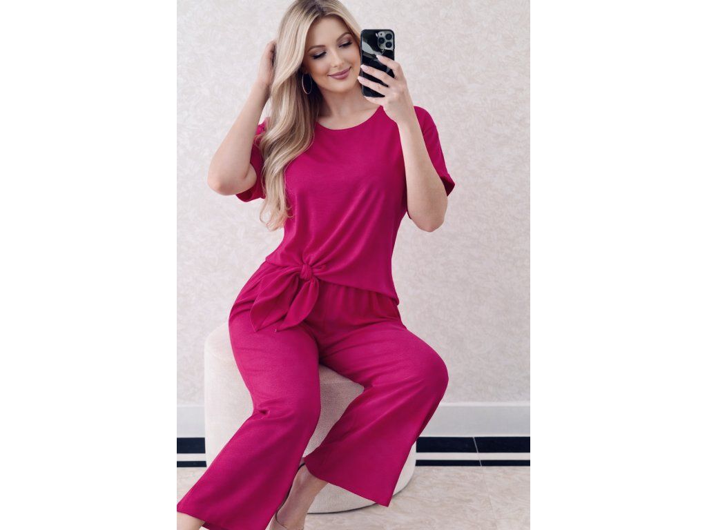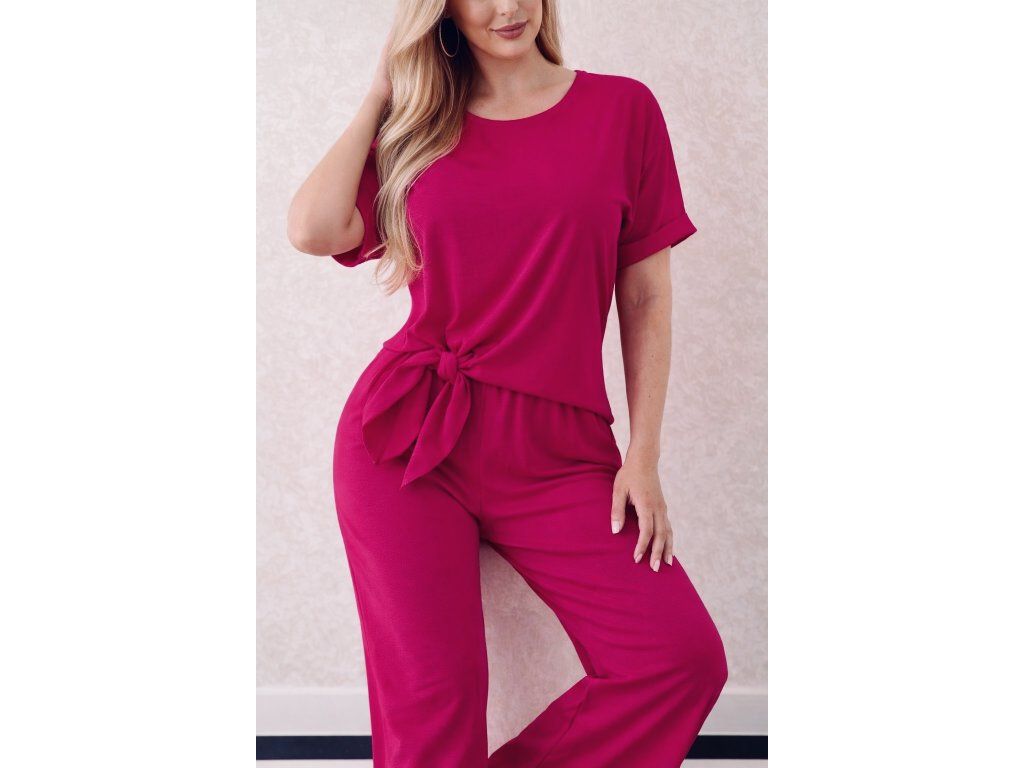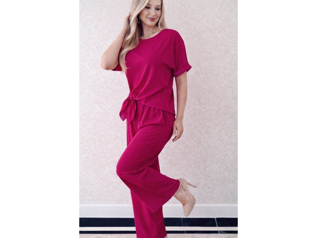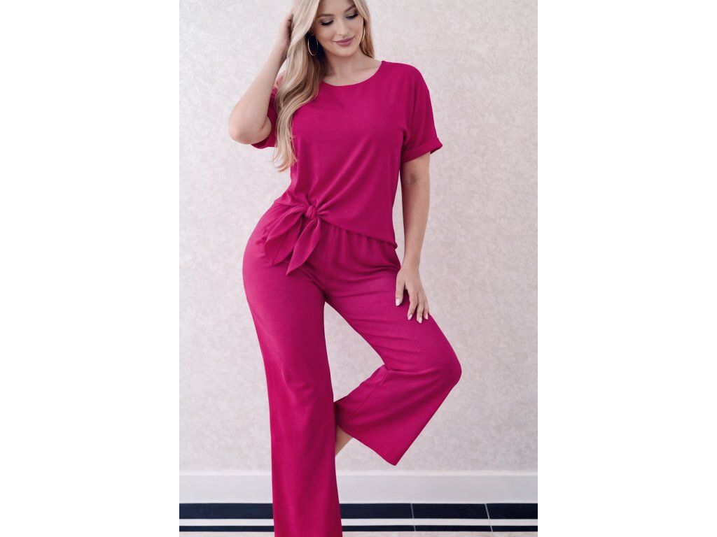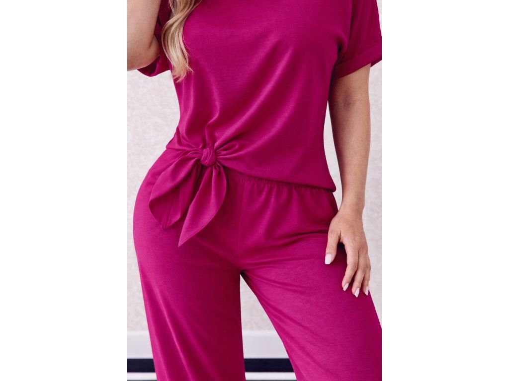 Štýlový a pohodlný dámsky komplet v krásnej výraznej fuchsiovej farbe, ktorý si zamiluješ na prvé oblečenie. Set pozostáva z voľnej blúzky s krátkym rukávom a moderným viazaním na boku, ktoré krásne zvýrazní postavu, a z pohodlných nohavíc s elastickým pásom.