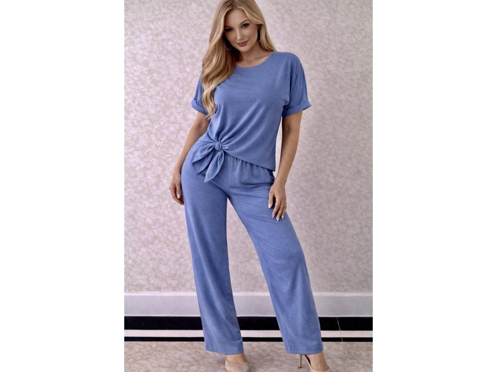 Voľný top s jemne spadnutými rukávmi a štýlovým viazaním na boku krásne zvýrazní postavu, zatiaľ čo pohodlné nohavice so širším strihom zabezpečia voľnosť pohybu počas celého dňa.