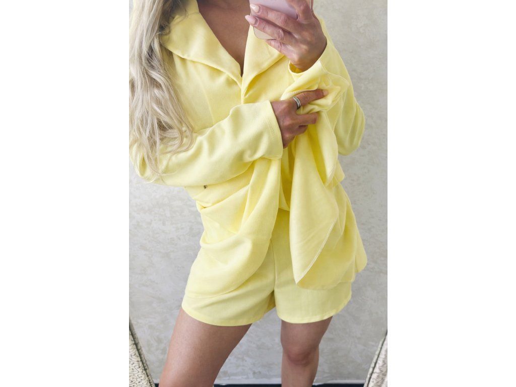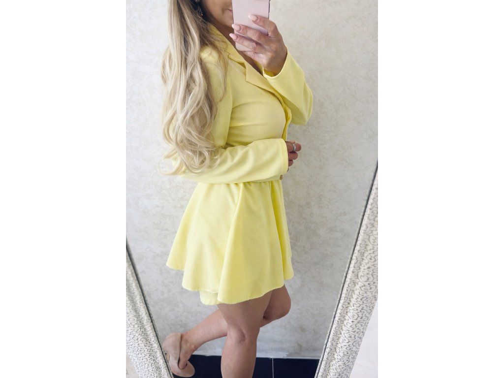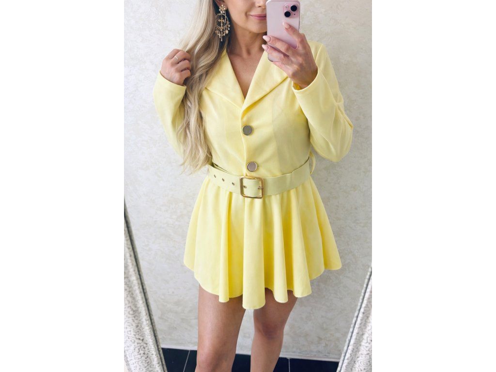 Jemná pastelová žltá farba krásne rozjasní outfit a dodá mu svieži, luxusný nádych. Sakoový vrch s golierom a ozdobnými gombíkmi pôsobí sofistikovane, zatiaľ čo áčková sukňová časť lichotí postave a zvýrazňuje pás pomocou opasku.
